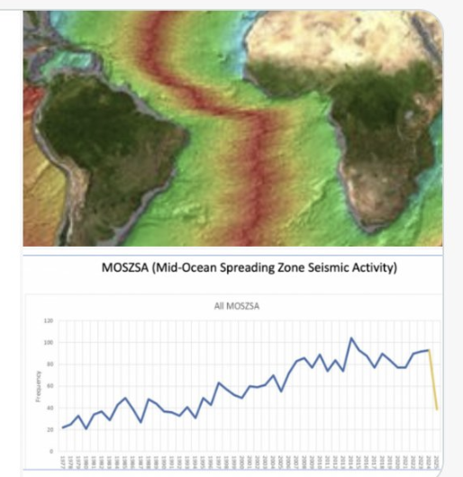 Grok’s Conclusion: The cooling of SST from 2024 to 2025, alongside the rapid drop-off in Mid-Ocean Spreading Zone Seismic Activity (MOSZSA), indicates that the reduced tectonic activity is likely a key factor in the observed temperature change. The decrease in magma upwelling along the Mid-Atlantic Ridge has reduced the heat input into the ocean, leading to cooler SSTs in 2025 compared to 2024. Other factors like ocean circulation or climate variability may also contribute, but the timing of the MOSZSA drop aligns closely with the SST cooling, supporting a direct geological influence.