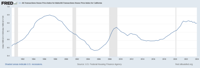 Looking at house prices is a way to assess how much of Idaho’s growth relative to California’s has to do with supply of housing versus demand for it. The next figure compares Idaho’s and California’s house prices.