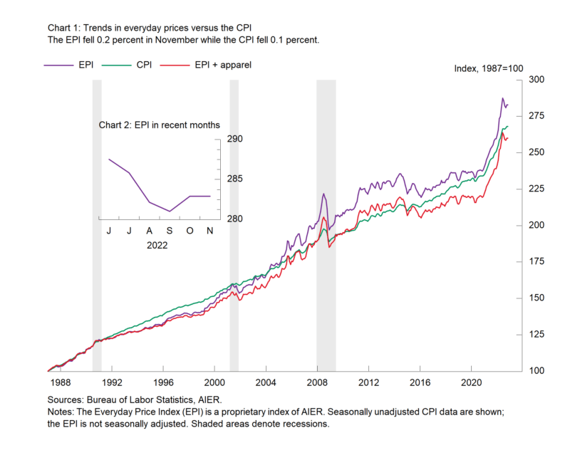 AIER’s Everyday Price fell 0.2 percent in November following a rise of 0.7 percent in October and declines of 0.4 percent in September, 1.3 percent in August, and 0.6 percent in July. The Everyday Price Index is up 8.7 percent from a year ago, the slowest since October 2021. Telephone services and food away from home were the top contributors to the rise in November, while motor fuel and home fuels and utilities had the largest negative contributions.