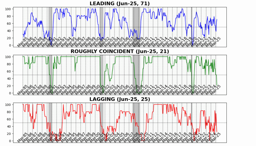 The setting has flipped in 2025. The Leading Indicator initially sagged (54 to 38 from January to April) before staging a sharp rebound to 63 in May and 71 in June, among its strongest readings in 18 months. Meanwhile, the Roughly Coincident Indicator faded from 67 in early 2025 to 21 in June, signaling a marked loss of near-term momentum. The Lagging Indicator has whipsawed, spiking to 83 in January, easing to 75 in February, then sliding to 42 in May and 25 in June, a considerable reversal of the expansion visible earlier in the year.