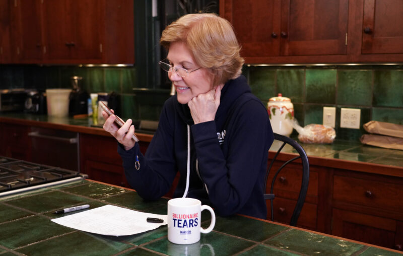 Senator Elizabeth Warren makes outreach calls beside her campaign’s ‘billionaire tears’ coffee mug. 2019.