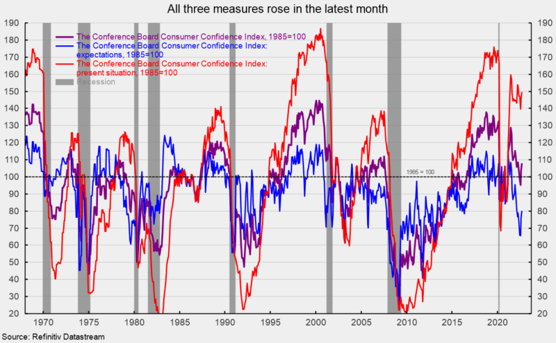 The expectations component added 4.5 points, or 5.9 percent, to 80.3 (see first chart) while the present-situation component – one of AIER’s Roughly Coincident Indicators – rose 4.3 points to 149.6 (see first chart). The present situation index is up 3.7 percent over the past year while the expectations index is down 7.4 percent from a year ago. The present situation index remains consistent with economic expansion while the expectations index remains consistent with prior recessions (see first chart).