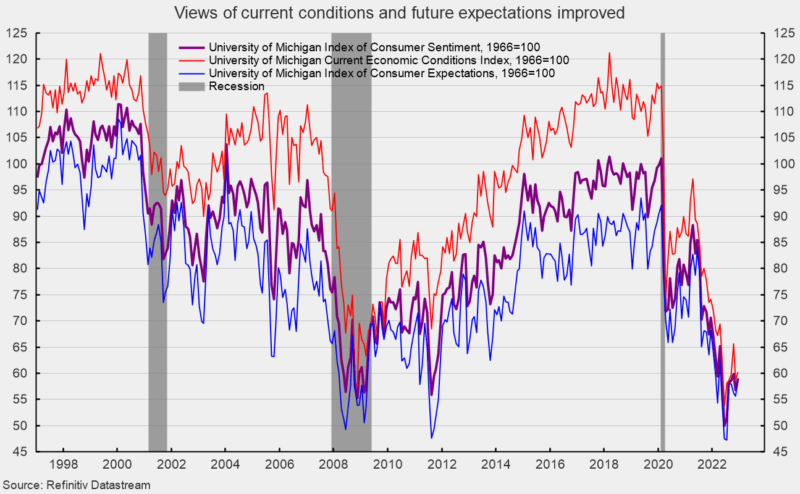The preliminary December results from the University of Michigan Surveys of Consumers show overall consumer sentiment improved for the month but remains near historically low levels (see first chart). The composite consumer sentiment index increased to 59.1 in December, up from 56.8 in November. The index hit a record low of 50.0 in June and is down from 101.0 in February 2020 at the onset of the lockdown recession. The increase in December totaled 2.3 points or 4.0 percent. The level of the composite index remains consistent with prior recessions.