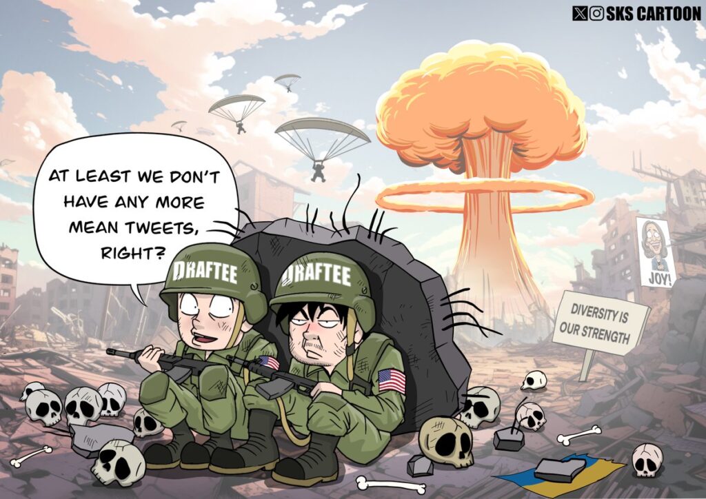 This cartoon was first published by SKS Cartoon. Please follow and subscribe on Twitter and Instagram.#debate point in cartoon, part one: war and peace