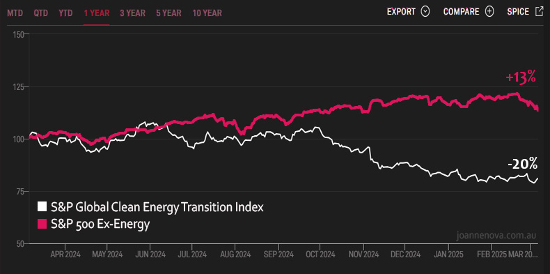 The great unravelling of the Green delusion continues. Amazing that there is still 80% of the clean energy sector value left on the chopping block.