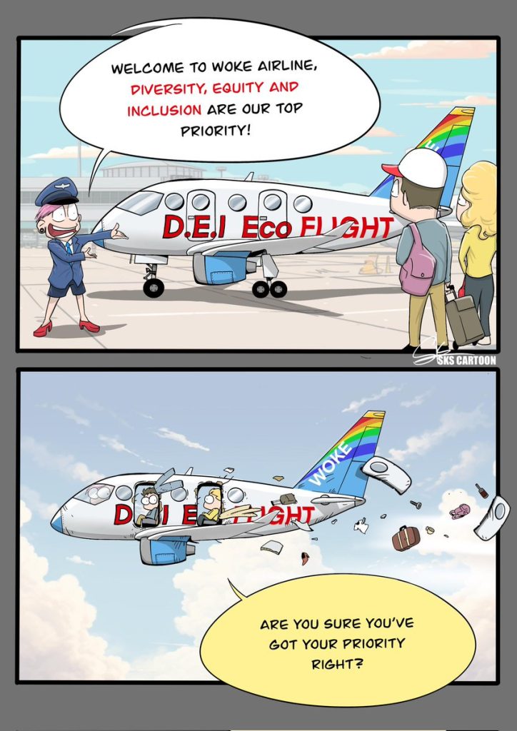 This cartoon was first published by SKS Cartoon. Please follow and subscribe on Twitter and Instagram.I hope Boeing takes notes, Wokism kills…