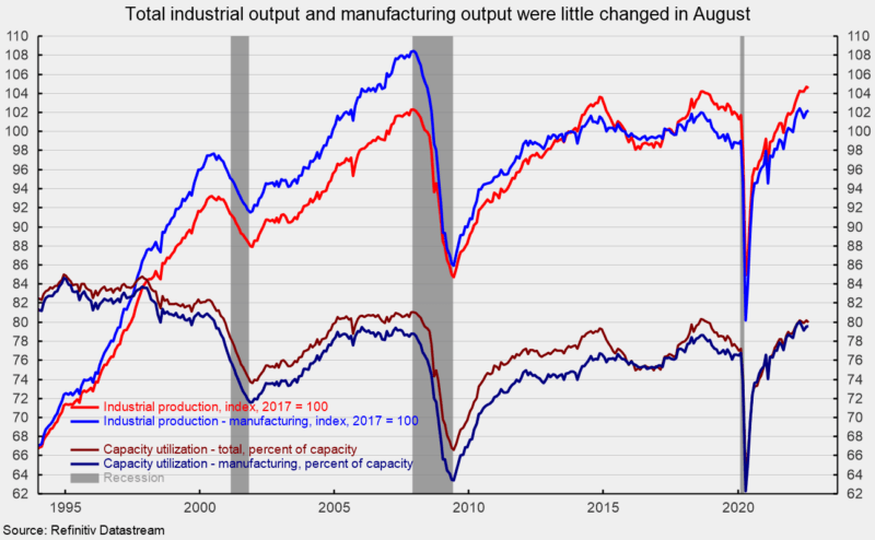 Overall, industrial output was little changed in August. Manufacturing output gained despite ongoing labor shortages and turnover, rising costs and shortages of materials, and logistics and transportation bottlenecks. Elevated price increases, weak consumer sentiment, an aggressive Fed tightening cycle, fallout from the Russian invasion of Ukraine, and Covid-19-related problems in China remain significant threats to the economic outlook. Caution is warranted.