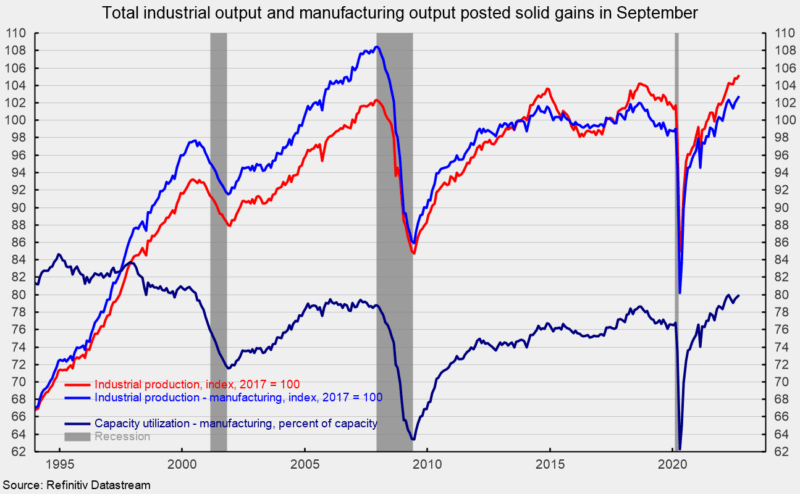 Overall, industrial output posted a solid gain in September, hitting a record high. Manufacturing output also rose on widespread increases. While most measures of economic activity suggest the economy continues to expand, elevated price increases, weak consumer sentiment, an aggressive Fed tightening cycle, and fallout from the Russian invasion of Ukraine remain significant threats to the economic outlook. Caution is warranted.