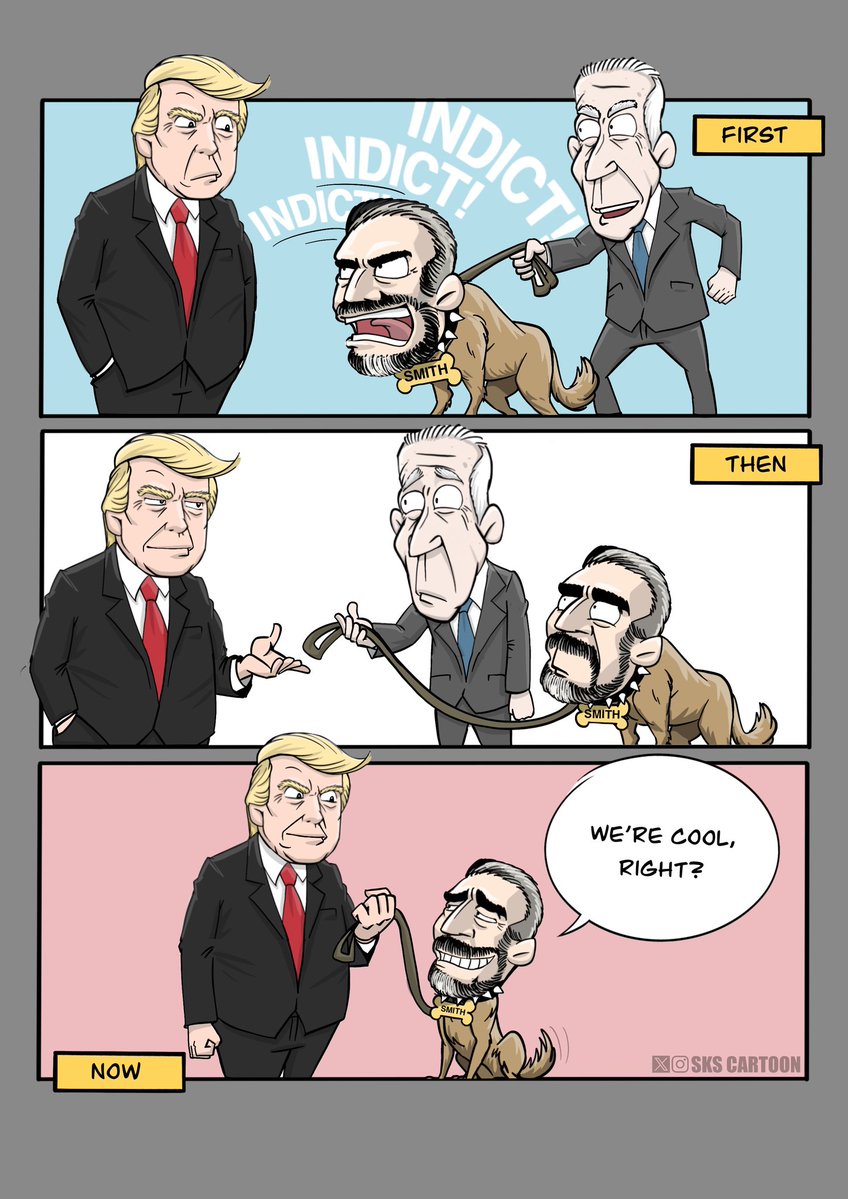 This cartoon was first published by SKS Cartoon. Please follow and subscribe on Twitter and Instagram.#jacksmith should be sued for malicious prosecution and charged with conspiracy against rights.