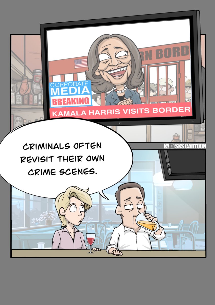 This cartoon was first published by SKS Cartoon. Please follow and subscribe on Twitter and Instagram.#KamalaHarris visiting the U.S. southern border is like a serial killer revisiting her own crime scene.