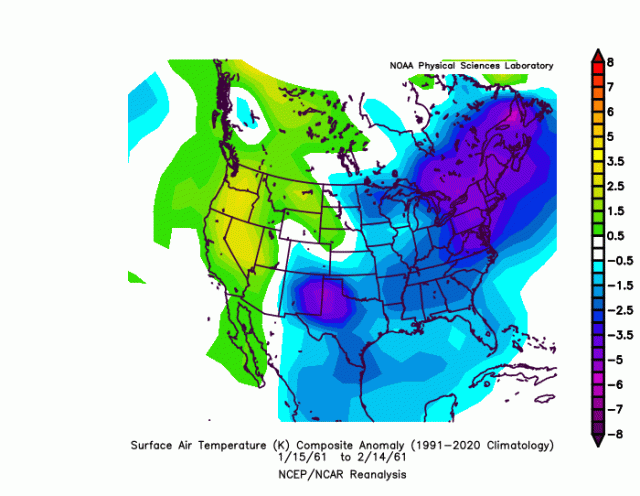 What gets me is how much of a no-brainer this is. When we get to Feb 14, the period from Jan 15-Feb 14 will be a top 10 cold period in my lifetime for the eastern U.S. Included in that is the chance that NYC breaks the 16-day streak of freezing or below-freezing temperatures set in the legendary winter of 60-61. How legendary? Well, RFK Jr. once commented on how he remembers sledding in DC in the winters when his dad was there. With good reason. Look at that period in 1961: