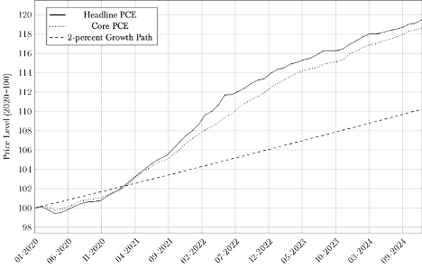 Nonetheless, by December 2024, the headline PCE price index was 8.4 percentage points above where it would have been had the Fed consistently met its two-percent inflation target. While inflation rates have come down from their 40-year highs, the price level remains permanently elevated relative to its target path. What caused the price level to diverge so persistently from the Fed’s target?