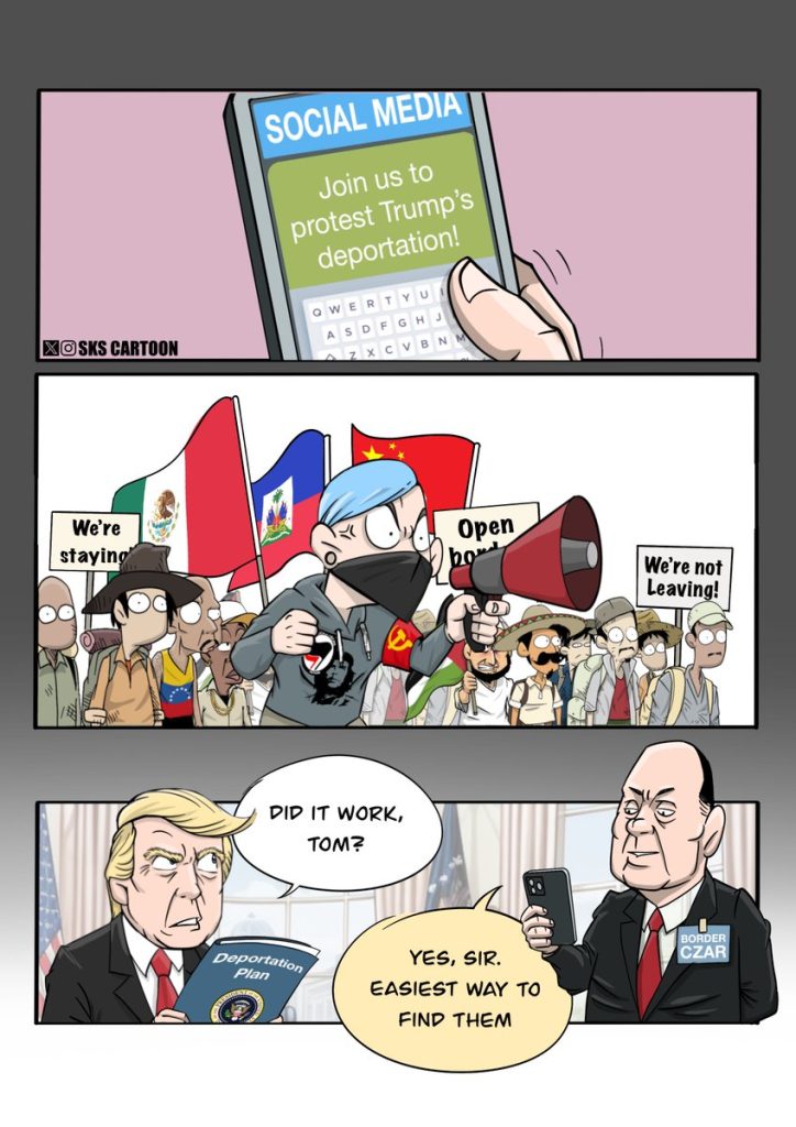 This cartoon was first published by SKS Cartoon. Please follow and subscribe on Twitter and Instagram.RT by @skscartoon: How much money are you willing to bet that #TomHoman the #borderczar is closely monitoring the anti-deportation protests?๐