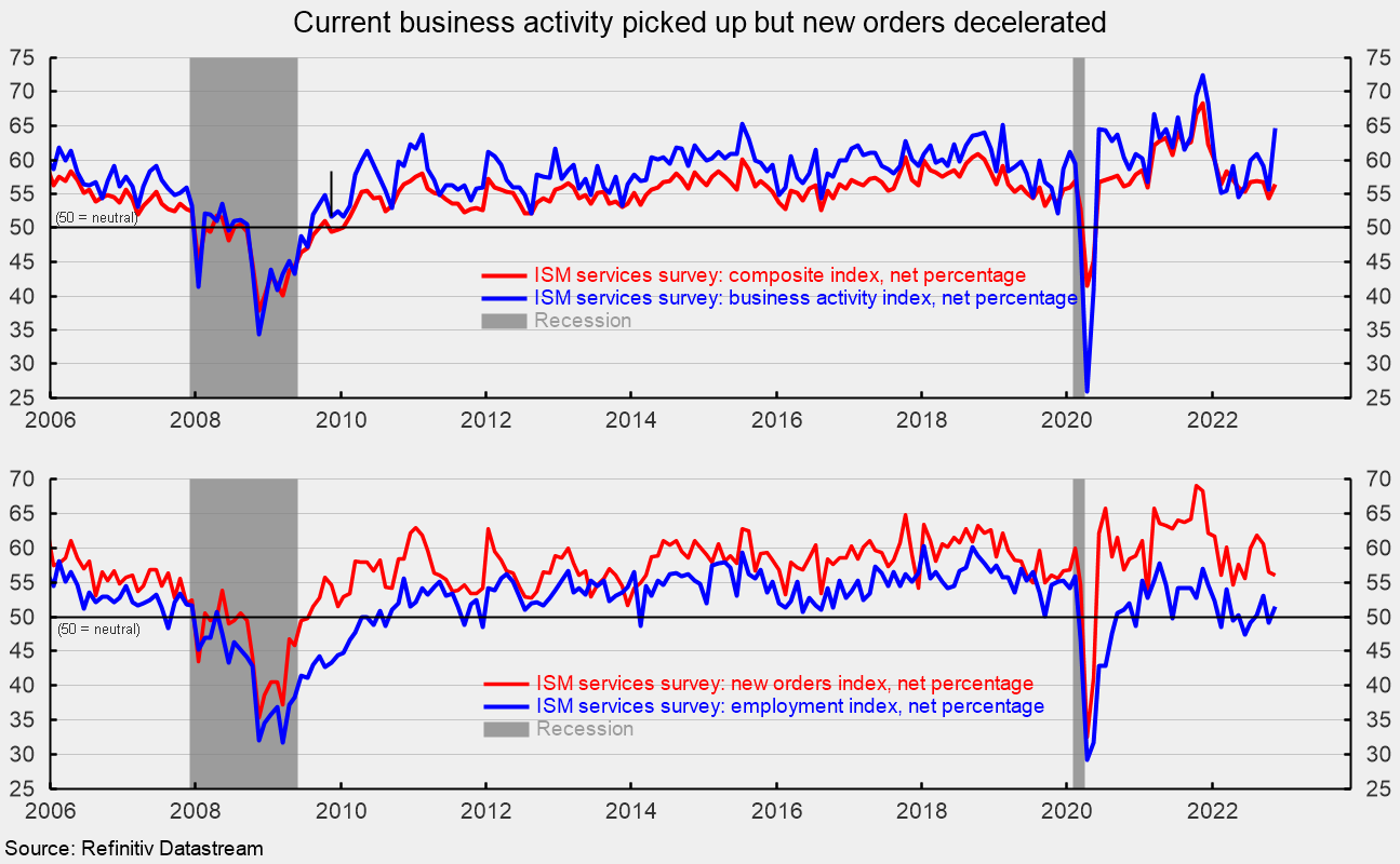The Institute for Supply Management’s composite services index increased to 56.5 percent in November, rising 2.1 points from 54.4 percent in the prior month. The index remains above the neutral 50 threshold and suggests the 30th consecutive month of expansion for the services sector (see top of first chart). The November results are about in line with the average of 56.1 over the last seven months.