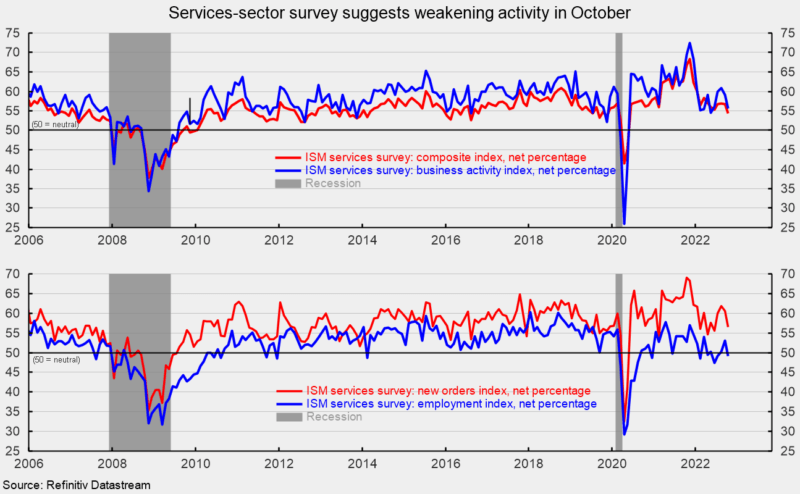 The Institute for Supply Management’s composite services index decreased to 54.4 percent in October, falling 2.3 points from 56.7 percent in the prior month. The index remains above the neutral 50 threshold and suggests the 29th consecutive month of expansion for the services sector, but at a somewhat slower pace (see top of first chart). The October results are the lowest since May 2020 and 2.4 points below the ten-year average ending December 2019 of 56.8.