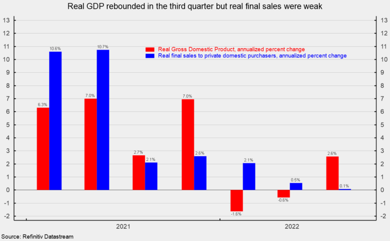 Real final sales to private domestic purchasers, about 88 percent of real GDP and a key measure of private domestic demand, has shown greater resilience, with growth having stayed positive despite declines in real GDP. However, growth has slowed significantly, from a 2.6 percent pace in the fourth quarter of 2021 to 2.1 percent in the first quarter, 0.5 percent in the second quarter, and just 0.1 percent in the third quarter (see first chart). Over the last four quarters, real final sales to private domestic purchasers are up 1.3 percent.
