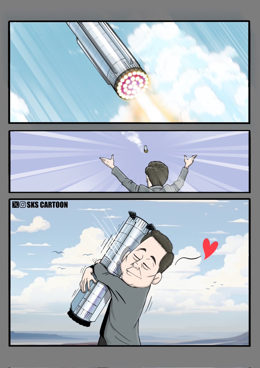 This cartoon was first published by SKS Cartoon. Please follow and subscribe on Twitter and Instagram.#starship7 booster successfully caught by the chopsticks, #Elon did it again!!