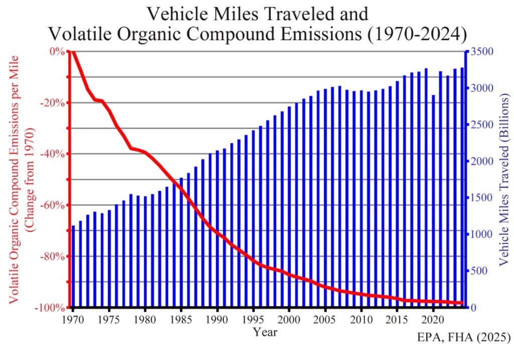 Early vehicle pollution regulations were enormously successful in eliminating harmful vehicle exhaust. Unleaded gasoline, catalytic converters, and particulate filters dropped volatile organic compound emissions per mile by 98 percent from 1970 to 2023. Carbon dioxide (CO2) and water vapor remain the only significant gases exhausted from today’s gasoline vehicles.