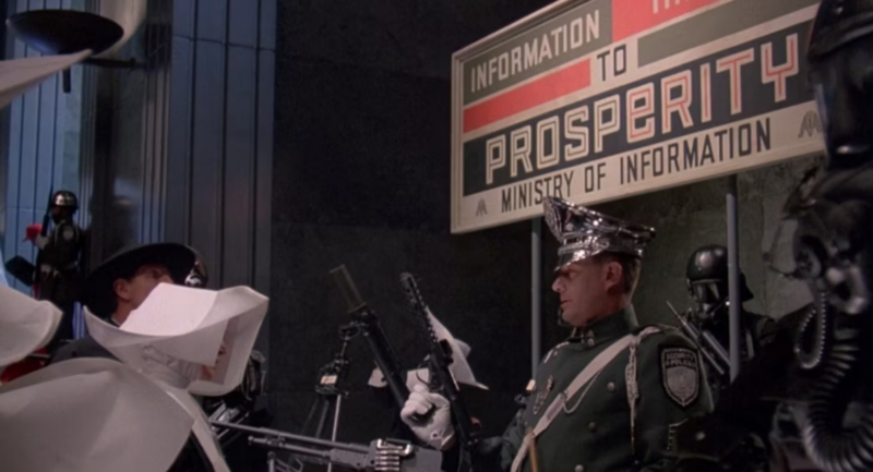 The plot begins with a literal bang, as a terrorist bomb explodes during a television commercial put out by Central Services, an arm of the government bureaucracy that, along with the Ministry of Information (MOI), represents state control bloated beyond all reason. On a wall behind one bureaucrat’s desk is a poster depicting a padlock shackling a woman’s lips. “Loose talk is noose talk,” the poster’s caption reads. Getting canceled in this dystopia is serious business, as the film’s protagonist Sam Lowry discovers.