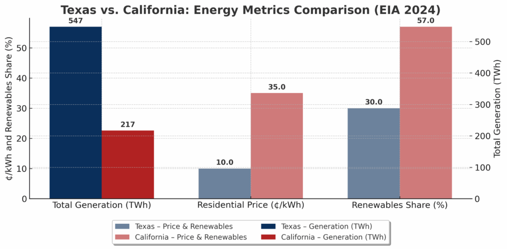 That chart tells the story: Texas still delivers more energy for less money, but the policy gap is closing — in the wrong direction. Texas is in danger of losing its competitive edge by repeating California’s mistakes.