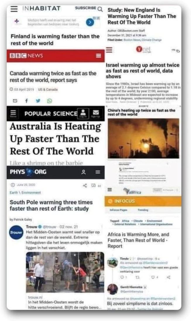 This meme has made the rounds before, and it made the rounds again this week. It shows the utter absurdity of scientific papers published in academic journals claiming various parts of the world have warmed faster than other parts.
