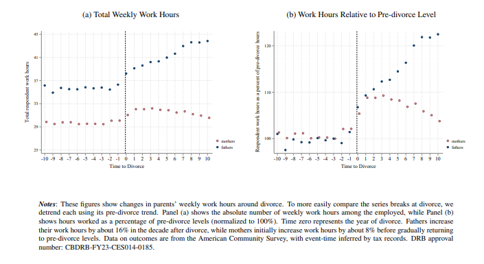 As a result of being unable to pool familial resources, parents work more and therefore see children less. They “find that mothers work 8 percent more hours after divorce, and fathers work 16 percent more after divorce.”