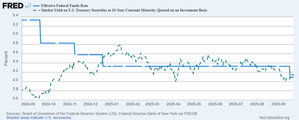 While the federal funds rate (FFR) has fallen by over 1 percent from 5.3 percent to about 4.1 percent. The 10-year Treasury rate, has risen nearly half a percent from 3.8 percent to about 4.2 percent. Not only did the rates not move in the same direction, they moved in opposite directions!