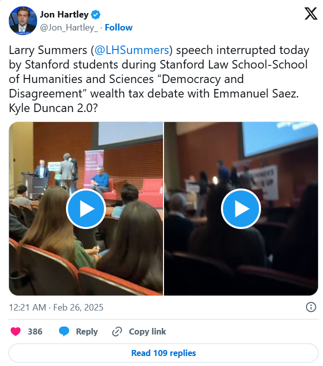 Last week, climate activists took the stage to interrupt a lecture by economist Larry Summers at Stanford Law School. The activists, who reportedly are members of Climate Defiance and apparently are not students, chanted and shouted over Summers for a full 10 minutes, preventing him from delivering much of his speech.