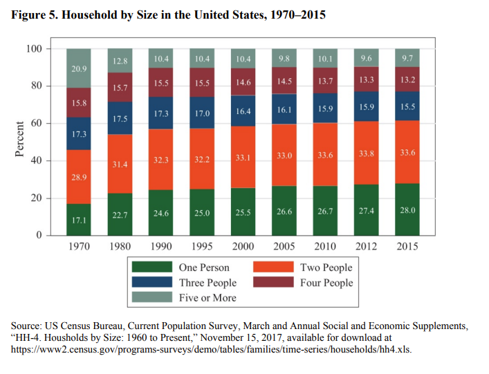 A major reason why income inequality appears to have increased is not just that the rich are earning more, but because of significant cultural shifts in household size and marriage patterns, which affect how inequality is measured. In the past, larger households with multiple earners helped balance income differences, while today, fewer people are getting married, more people live alone, and single-parent households have increased. As a result, more households rely on a single income instead of combining earnings, making household income appear lower even if individual wages have remained stable, as shown in Figure 5: Household by Size in the US (1970–2015).