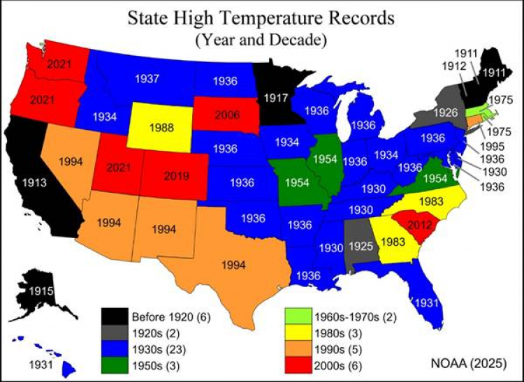 The National Oceanic and Atmospheric Administration (NOAA) tracks state record high temperatures and the date when they occur. The data shows that 36 of the 50 state record highs were set more than five decades ago. Twenty-three state record high temperatures occurred in the decade of the 1930s, when annual human CO2 emissions were less than one-eighth of today’s emissions. Despite endless headlines about heat waves, only 6 state high temperature records have occurred since the year 2000.