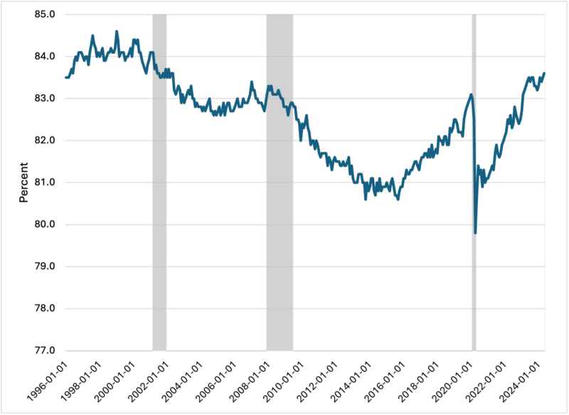 Source: U.S. Bureau of Labor Statistics, Labor Force Participation Rate [CIVPART], retrieved from FRED, Federal Reserve Bank of St. Louis; https://fred.stlouisfed.org/series/CIVPART, June 7, 2024.