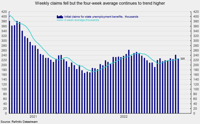 Initial claims for regular state unemployment insurance fell by 16,000 for the week ending November 26th, coming in at 225,000. The previous week’s 241,000 was revised up from the initial estimate of 240,000 (see first chart). The four-week average of weekly initial claims rose to 228,750, up 1,750 for the week. That was the fifth increase in the last seven weeks and the highest level since September 3rd (see first chart).