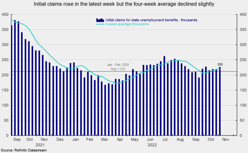 The four-week average fell to 218,750, down 250 for the second week in a row. The four-week average peaked in early August and trended lower through the end of September. It drifted slightly higher until the back-to-back slight declines in the last two weeks. Overall, the data continue to suggest a tight labor market. However, continued elevated rates of price increases, an aggressive Fed tightening cycle, and fallout from the Russian invasion of Ukraine remain risks to the economic outlook.