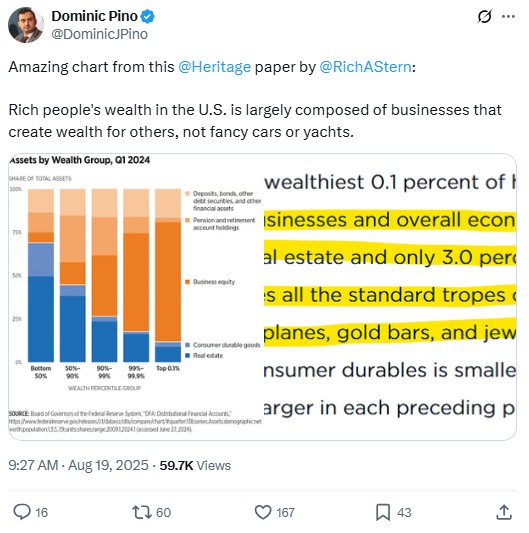 A recent report from The Heritage Foundation argues that “the wealthy” are not “idle idols” but are instead owners and investors of wealth-creating ventures. Through their ownership of productive assets, they are the driving force behind overall wealth creation in the country and, in some cases, the world. The report reveals a crucial truth that is often lost in today’s political rhetoric: the overwhelming majority of American wealth among the most wealthy (88.2 percent) consists of assets linked directly to businesses and economic production. Despite the commonly accepted belief that millionaires hold their money in real estate or “yachts, sports cars, private planes, gold bars, and jewelry,” most of that wealth is investment, not consumption goods.